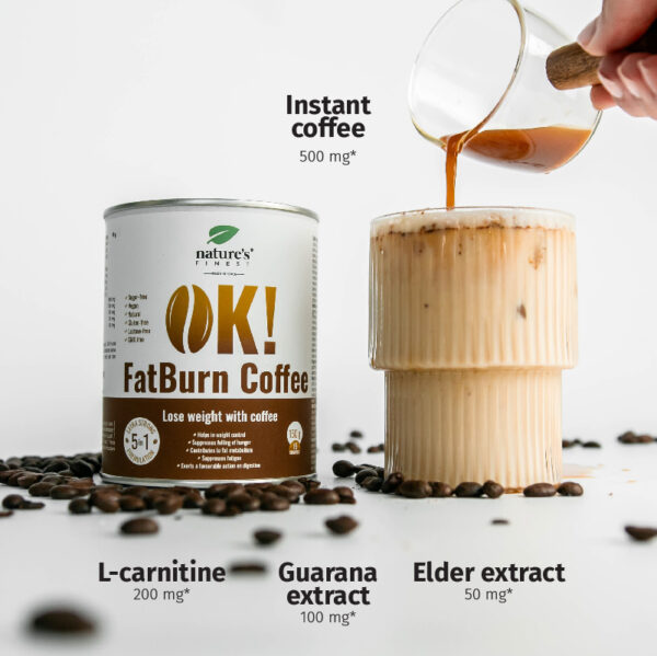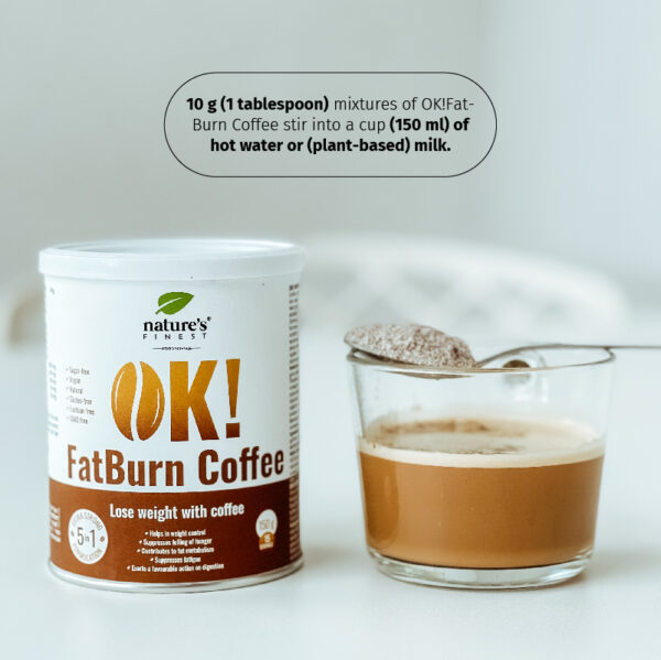 OK!FatBurn Coffee ist kein Ersatz für eine ausgewogene und abwechslungsreiche Ernährung sowie einen gesunden Lebensstil. Die Anwendung wird für schwangere und stillende Frauen nicht empfohlen.